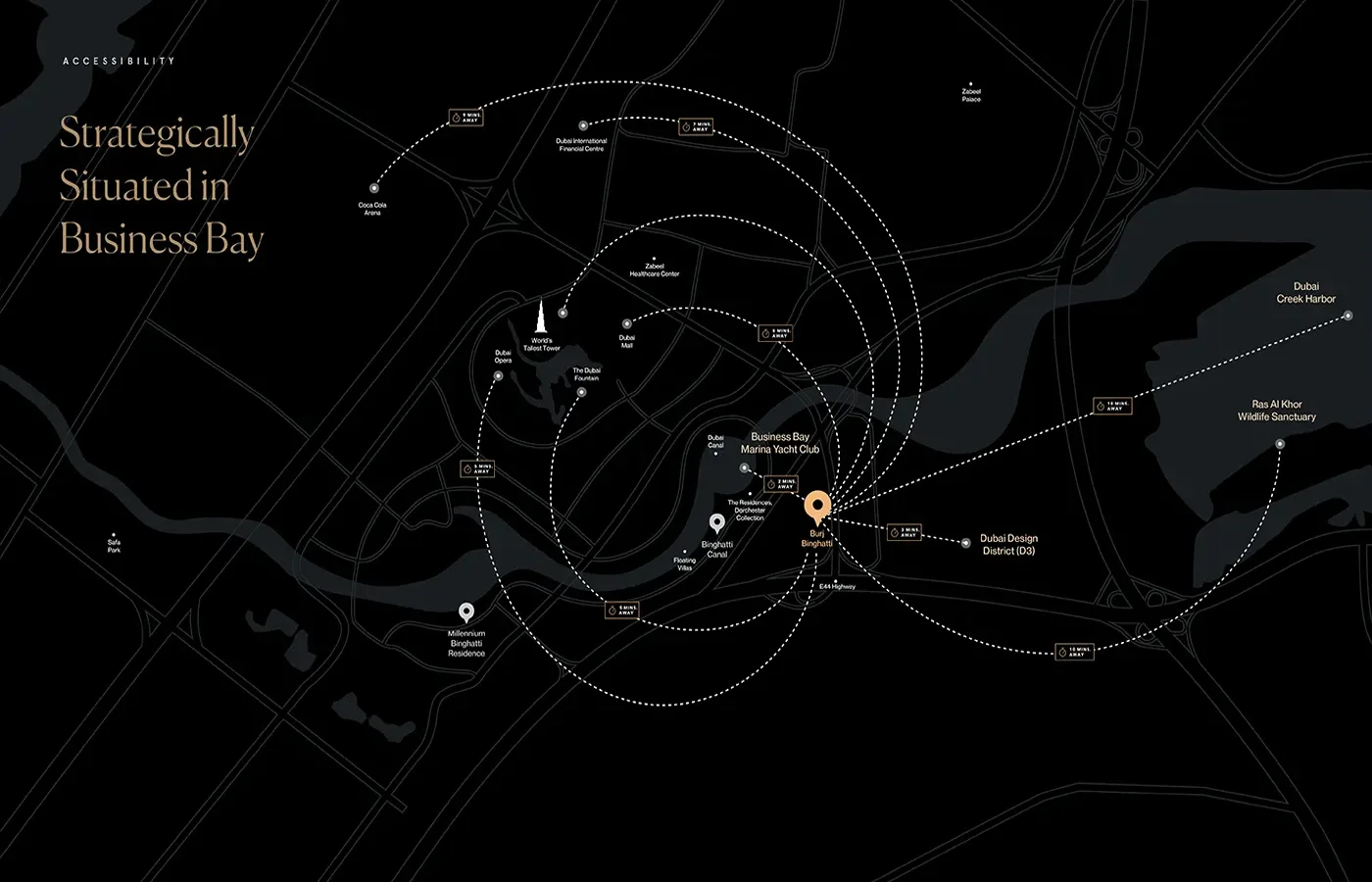Burj Binghatti is located in the heart of Business Bay, offering proximity to Downtown Dubai, Sheikh Zayed Road, Dubai Canal, and key business and leisure destinations.