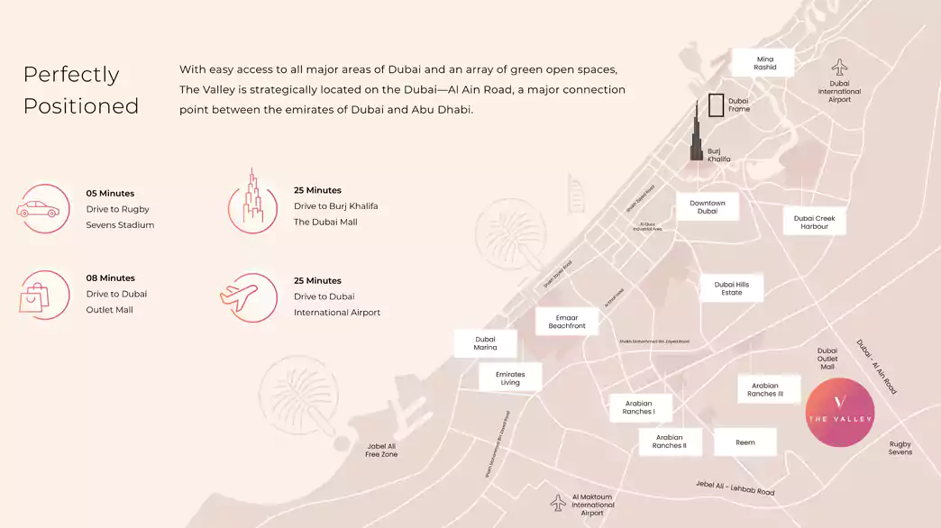 Orania at The Valley sits in The Valley, providing quick access to Dubai Outlet Mall, Downtown Dubai, and Dubai International Airport within a short drive.